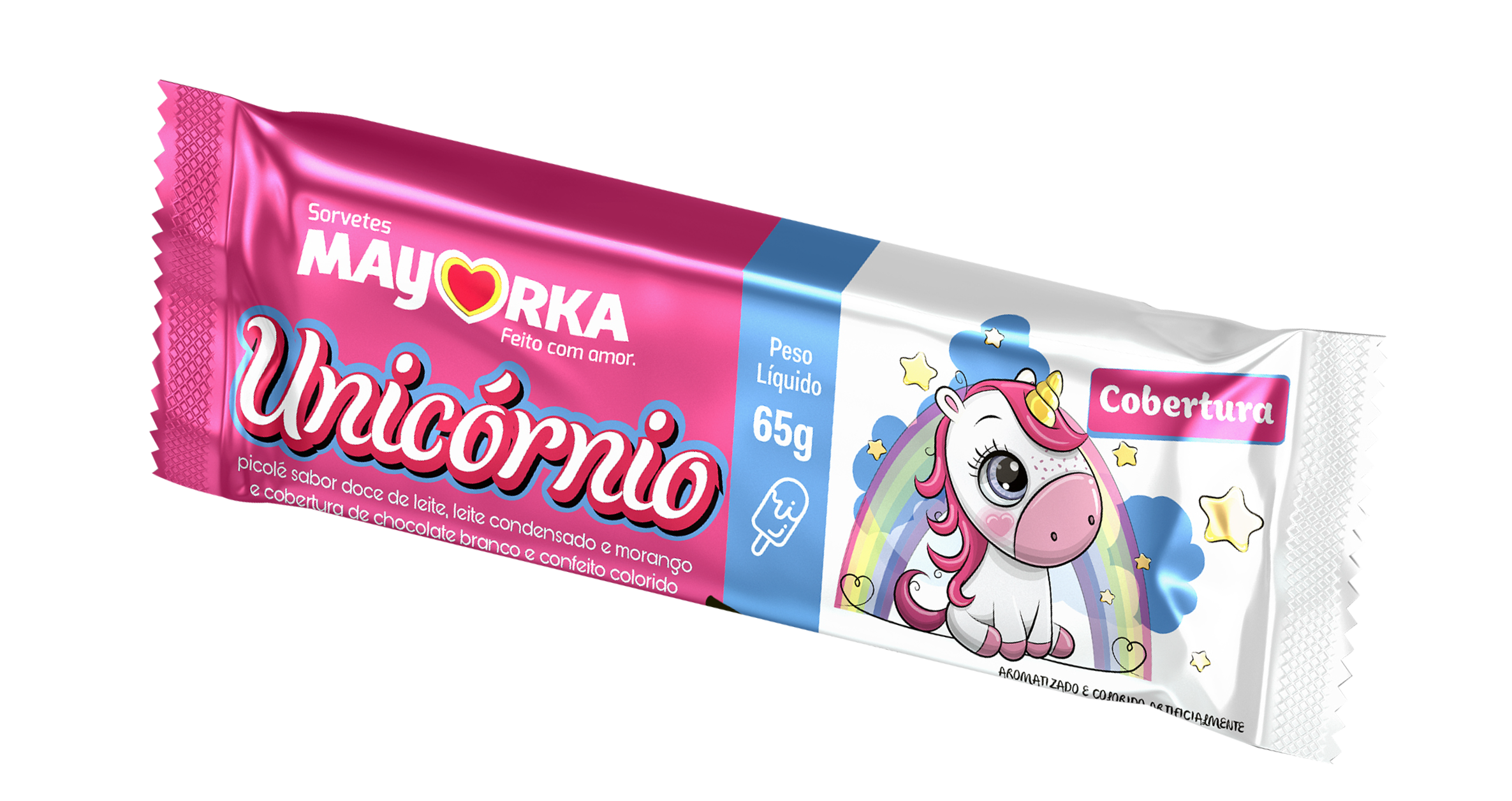 Picolé Cobertura. Com os sabores Tentação, Brigadeiro, Unicórnio