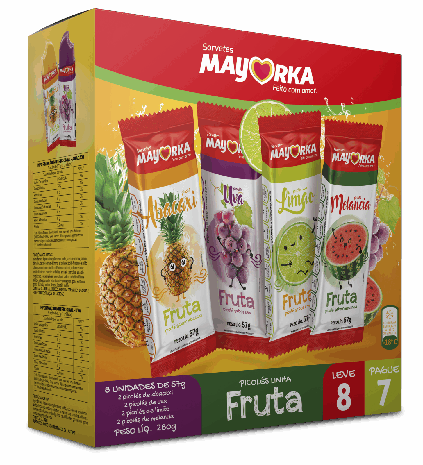 Picolé de fruta para refrescar nesse verão. Com os sabores Melancia, Abacaxi, Limão e Uva.